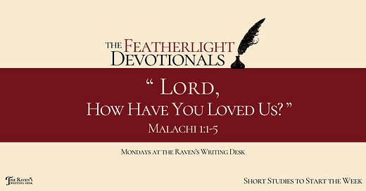 This is the first of the new “Featherlight Devotionals” series, looking first at the book of Malachi. Every Monday morning, I will release a short study, which will give you some context, and encourage you to read, reflect on, pray through, and contemplate the passage. Today we’ll be looking at Malachi 1:2-5. I highly suggest you use your own Bible for the reading, and set your phone aside if you can.