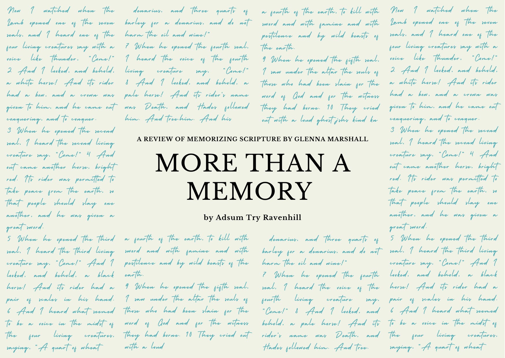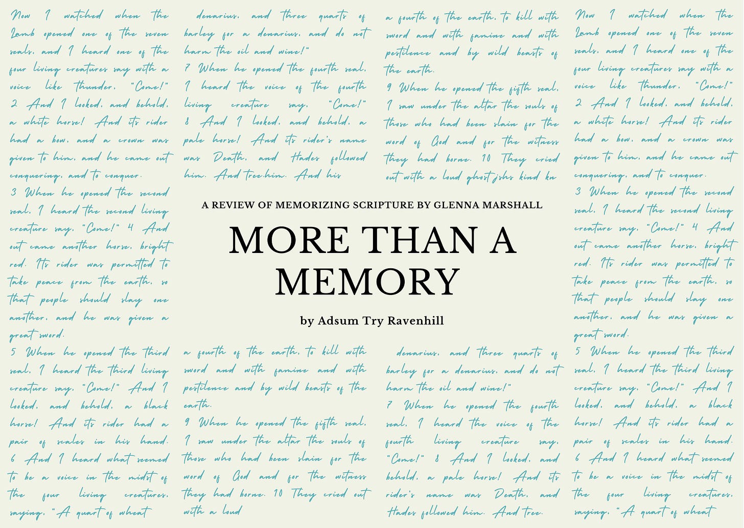 A important figure in my life had repeatedly held this word over my head, until it had been imbued with such power as to forge it into a weapon. That weapon would come out of nowhere, and with increasing regularity, it seemed. Countless songs and books seemed to expound upon it, often at length, and I found myself in tears every time. Experiences like this, I gather, are common, therefore we know that memory is more than just a tool for passing exams, but for some reason, when it comes to the task of learning scripture, we think more about the task, and less about the outcome—which can be far, far more powerful than a weaponised word.